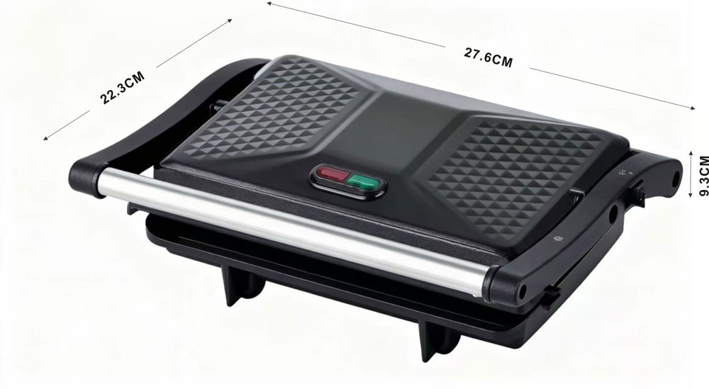 | মূল বৈশিষ্ট্য | আল্ট্রা-পোর্টেবল (1.5kg, 276*223*93mm), নন-স্টিক লেপ প্লেট, ফ্লোটিং কব্জা সিস্টেম, 180° ওপেন গ্রিল মোড, কুল-টাচ সেফ হ্যান্ডেল, অয়েল ড্রিপ ডিজাইন, পাওয়ার অন এবং রেডি লাইট |